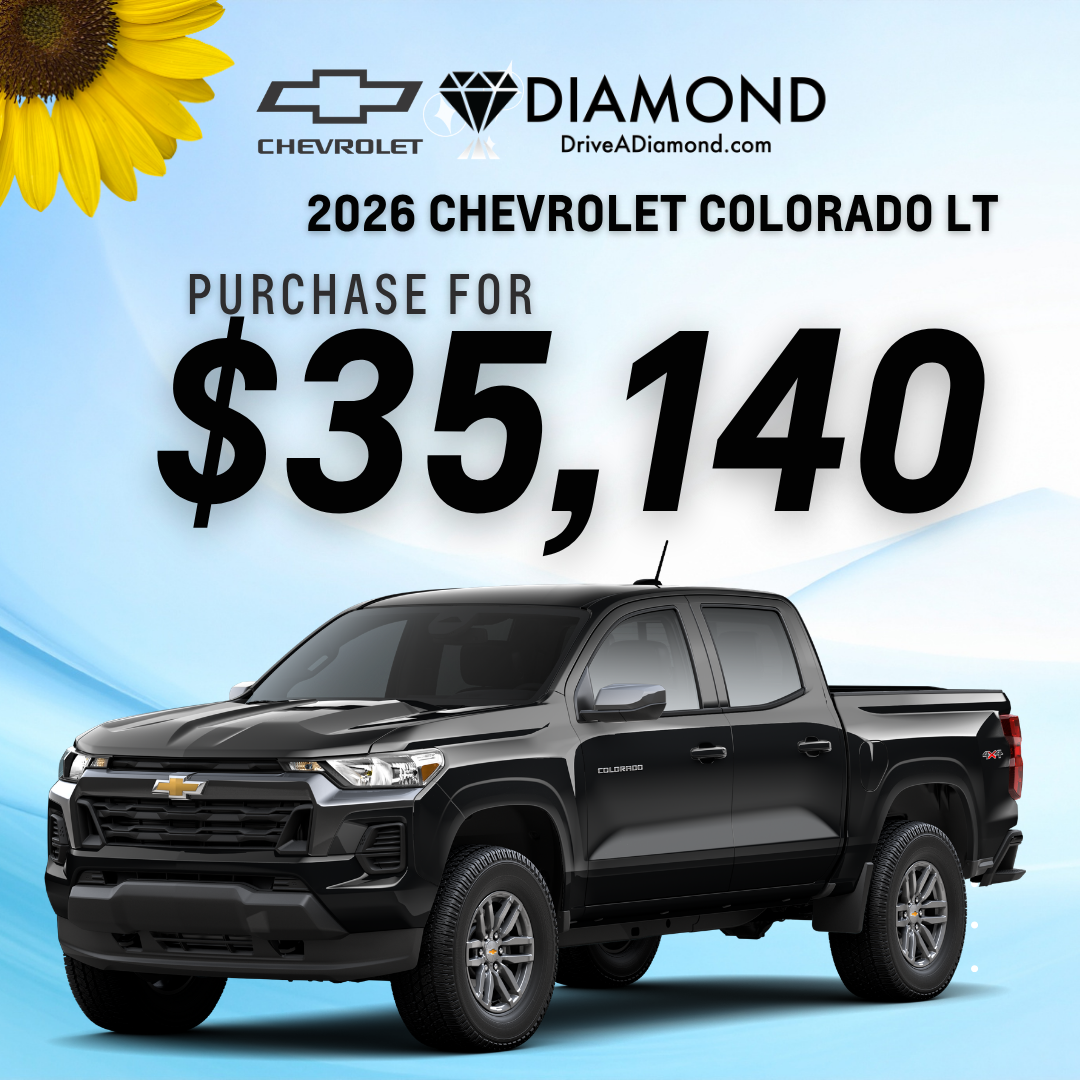 "1 at this price Stock # 2N138769 - $4000 OFF DIAMOND SPRING SAVINGS. $1000 CUSTOMER CASH. GENERAL MOTORS IS ANNOUNCING THE CONQUEST INCENTIVE TO CUSTOMERS WHO CURRENTLY OWN OR LEASE A 2012OR NEWER VEHICLE Ford Ranger, Honda Ridgeline, Jeep Gladiator, Nissan Frontier, Toyota Tacoma, Ford Bronco, Jeep Wrangler $2000 REBATE. The Manufacturer's Suggested Retail Price excludes tax, title, license, dealer fees and added equipment. Dealer sets final price.. OFFER ENDS 04/30/2026"